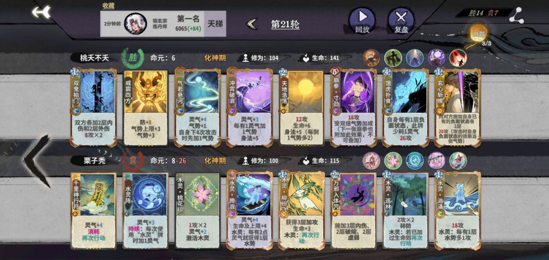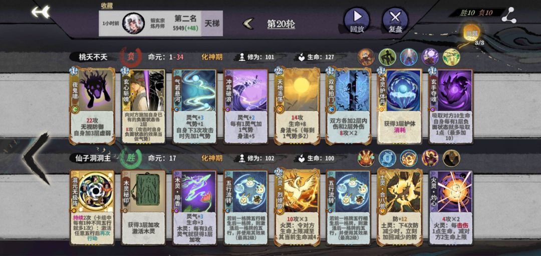 说下具体玩法,第一轮开局小布,不要d牌,有啥玩啥,第二轮选丹,然后如果开局不是天胡二级劈山加二级抱气的情况下,直接卖掉所有牌留一张,升本选本命仙命牌,一号位,过,第三第四回合,混,尽量不要d牌,除非全是废物牌,这里休息尽量拿防御丹和回血丹的效果牌,以及加防的牌和减血少的牌,尽量多一些回合数多补一下煅体,5回合应该要能21体升本。
