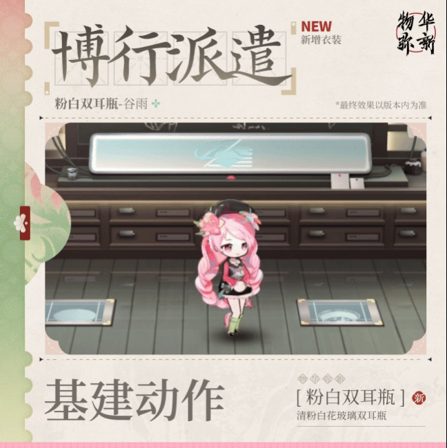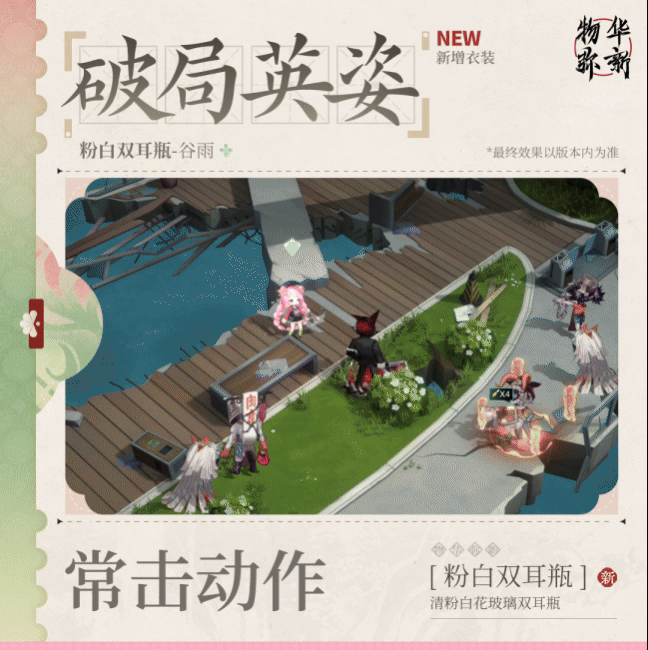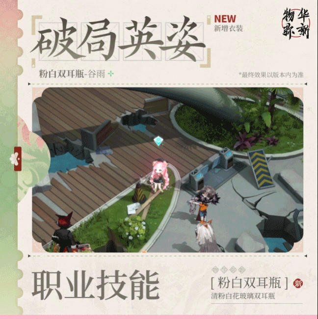 *收集该衣装,即可拥有粉白双耳瓶全新破局英姿、破局音效、派遣公司休闲动作。