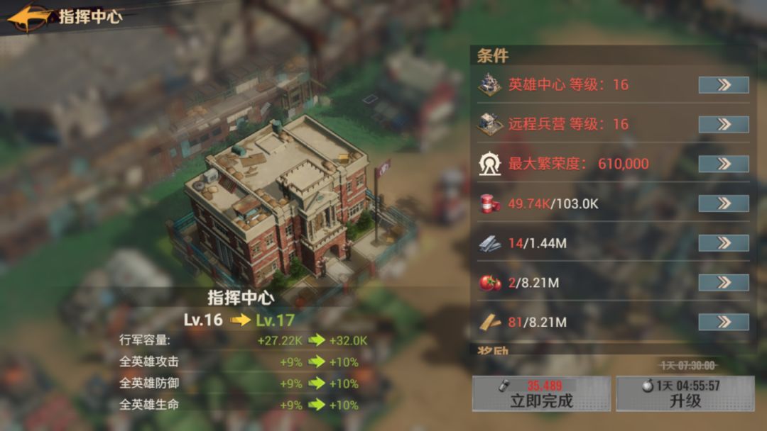2、对于月卡玩家而言,若未拥有第二建造列队,那么在建筑升级方面与零氪玩家并无太大差异,同样需要侧重选择关键建筑进行升级。首要任务便是优先升级【指挥中心】、【英雄中心】、【三大兵营】以及【研究院】。特别需要注意的是,【英雄中心】与【三大兵营】中的某一建筑,将是【指挥中心】升级的前提条件。因此,在资源有限的情况下,应优先确保这些核心建筑的升级,以推动整体游戏进程的顺利进行。