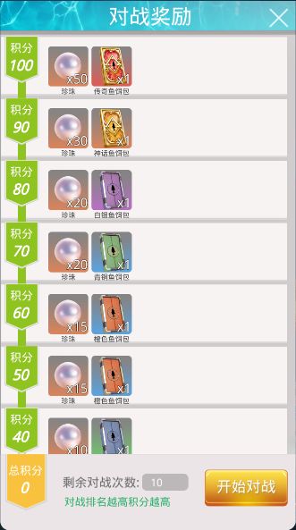 4、每日都会刷新免费10次的对战次数,只要按照攻略方法去操作,那么海量的珍珠、鱼饵统统都收入囊中,助您快人一步升级鱼饵,高等级鱼饵也将助你在【重量赛】收获更重的渔获!