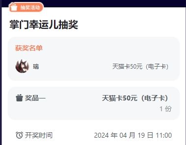 活动结束将由TapTap抽奖系统随机抽取1位幸运儿掌门获得:50元天猫卡(电子卡)