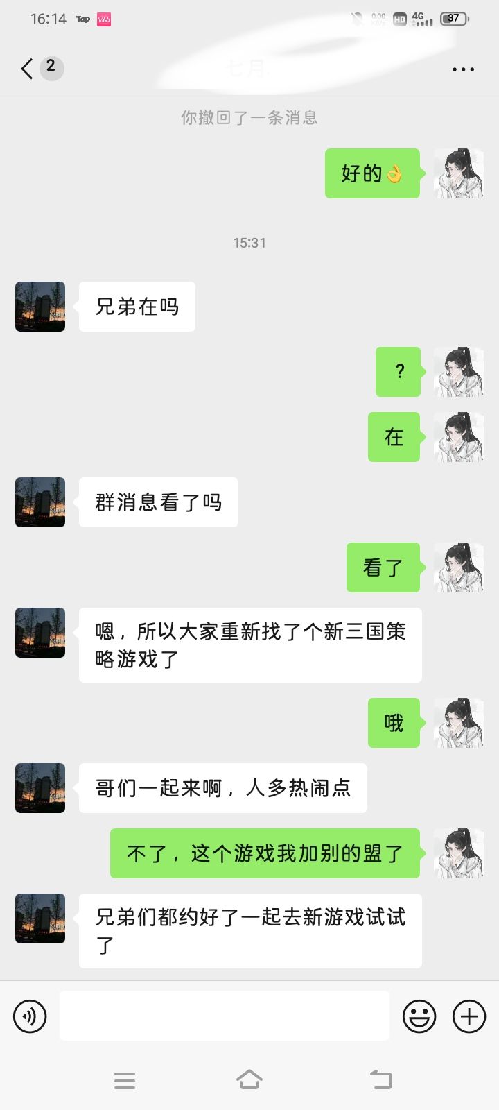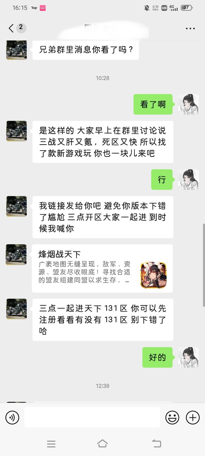 个我是这两天开始玩的游戏,一开始还正常游玩,直到我加了个联盟,一开始群里都挺正常的,交流武将,功略,有一个人开了个头说什么这游戏好玩吗?说完就有几个人开始你一言我一语,这时"盟主”就问有没有比这好的游戏,说完就有人把这个游戏发了出来,