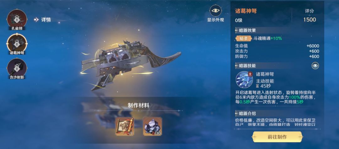 诸葛神弩:中级暗器,收集图纸材料后,找唐三打造即可,材料收集相对较为简单。价格低廉,改造空间极大,可以用此来保卫自己,效果不错。由铁精打造,对付魂宗以下对手绰绰有余。
