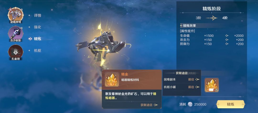 精炼可以提升暗器阶级,获得属性提升,橙色及以上暗器每10阿提升1次暗器技能效果。暗器的精炼材料,可通过团队副本和机枢小铺获得。