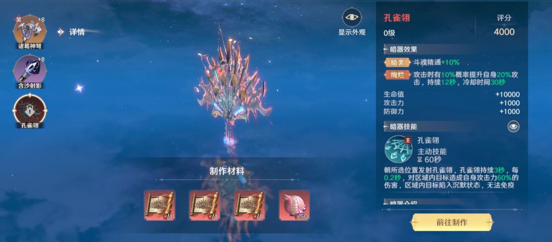 孔雀翎:高级暗器,收集图纸和材料,后找唐三进行打造即可,材料收集有一定的难度。唐门群体攻击暗器,工艺最为复杂。