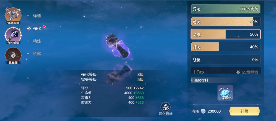 3.暗器可以进行强化,成功强化可以使暗器的属性增幅提升,并激活强化目标的效果。每个强化等级强化到100%时视作为完美强化,计入完美总等级。强化有一定概率失败,失败会消耗材料,但不会降级。