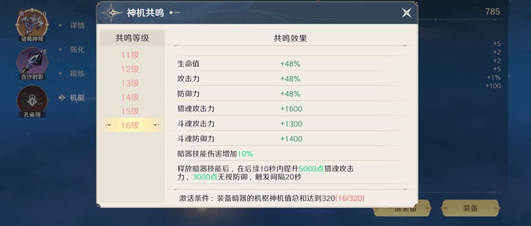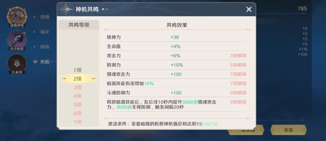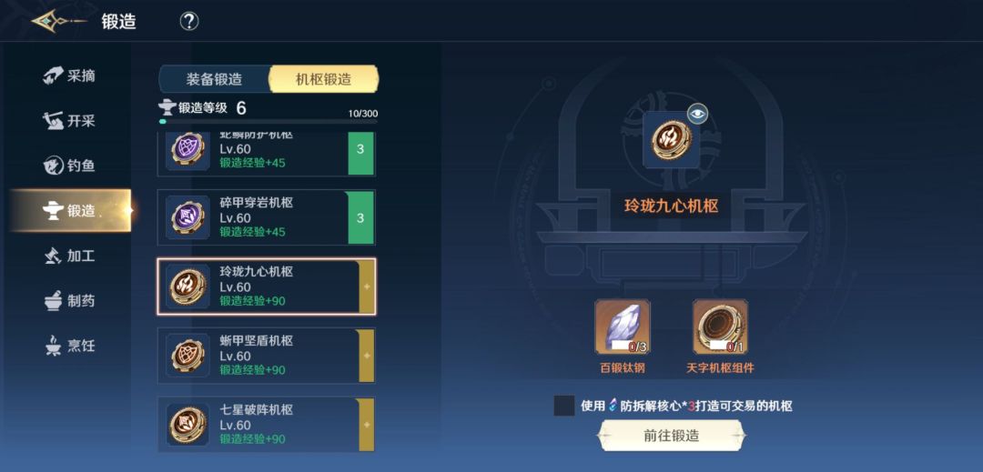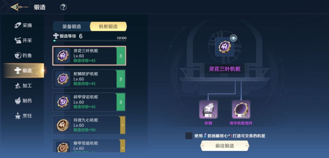 通过锻造可以获得暗器机枢,机枢只会在装备着的暗器上生效。增加相同属性的机枢属于同类机枢,无法装备多个同类型机枢,可以收集3个同品级同类型机枢升至更高的品级。