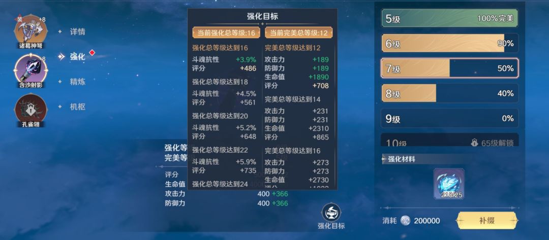 4.强化目标分为强化总等级和完美总等级目标,达成指定条即可激活额外属性加成