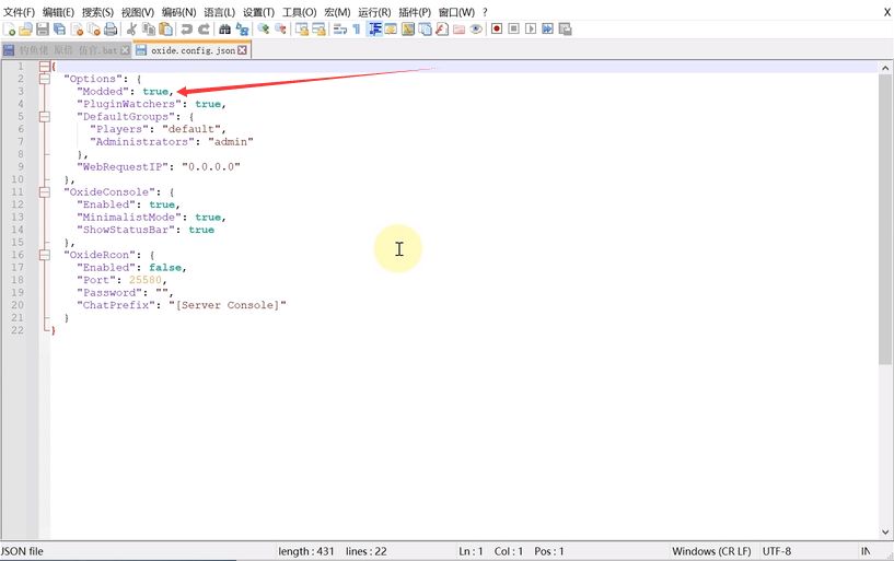 那么怎么把我们带有插件mod的模组服务器切换到社区服务器 这里大家看自己个人习惯,有需要切换会社区服的小伙伴那么进入到你的服务器后台将运行的服务端完全关闭,然后找到Oxide文件找到oxide.config.json文件,右键用Notepad++程序打开编辑 将文本中Modded:‘’true’’ 改为false就可以 这个意思很简单就是开启了模组服我们将他关掉就好了
