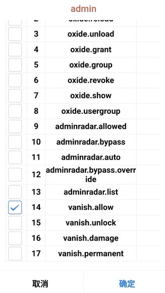举例:安装Vanish隐身mod插件时我们需要到rust+手机app里面去操作权限输入你的IP加管理员端口密码进入最下面点击权限找到admin去授权反正大家在安装时多看看插件mod作者给到的介绍顺着他的意思去操作肯定是没问题的