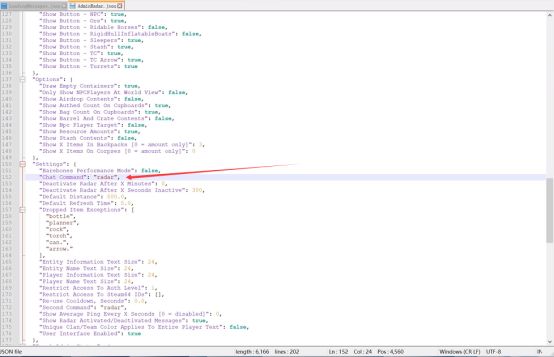 举例:安装AdminRadar插件mod雷达的意思,原官方的调用命令为/radar那么我们国人用起来或是根据个人习惯肯定是ld会比较方便嘛,那么直接在Rust Server > rustds > oxide > config路径下找到我们放进去的AdminRadar.json文件右键编辑修改这一栏Chat Command: