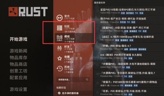 注:当我们的rust服务器安装完插件后细心的小伙伴肯定发现了在rust面板上我们原本属于社区服务器现在到了模组服务器
