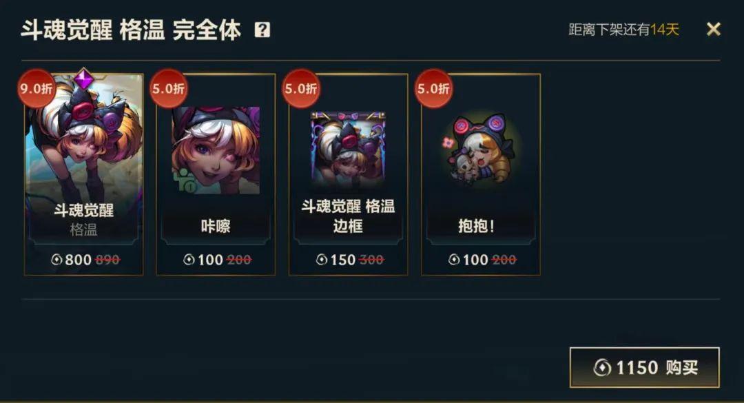 喜欢的召唤师可以分别以1590点券、1410点券、1150点券、1050点券的优惠价格,分别购入斗魂觉醒 莎弥拉 完全体、斗魂觉醒 卡莉丝塔 完全体、斗魂觉醒 格温 完全体和斗魂觉醒 烬 完全体。