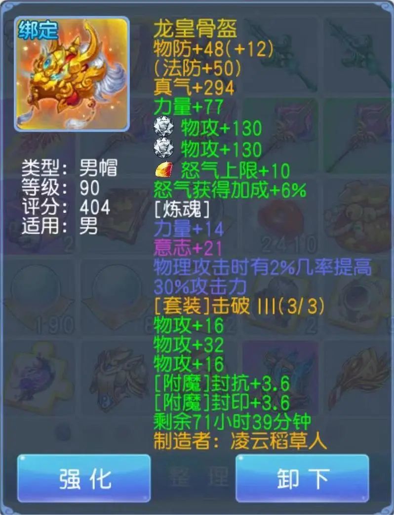 距离满基础属性就差1点物防的帽子,基础属性非常OK!附加属性更是nice!又是一件单加力量的装备!这种装备都不用讲,单加属性永远都是nb!77的力量给予了人物超强的物攻加成!炼魂……没眼看没眼看,属性对了,但是太低了,特效对了,但是颜色太蓝了!继续努力洗吧!