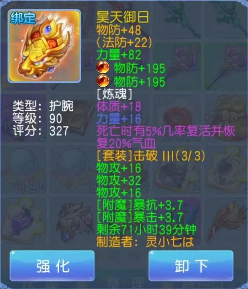 这件装备距离全满基础属性就差了3点物防, 单纯从基础属性上来讲,已经是非常优秀了!但是优秀的东西总是会一直优秀下去的,附加属性单加力量82,游戏中的代表!跟护腕一样,绝对可以一直带下去了!炼魂方面虽然比其它的部位看起来好,但是没有力量很难受……不说了,洗练吧!洗洗更上一层楼!