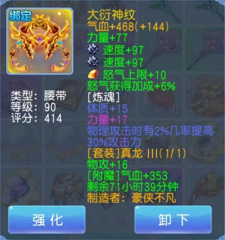 那么接下来我们看一看这件腰带怎么样?首先基础属性方面。这件装备距离满属性差了12点气血!差距并不算是很大,完全可以接受。附加属性非常完美,虽然说只有77点的加成!但是它的77点也是单加力量!附加属性很OK!炼魂方面……不多说了,继续洗炼一波吧!