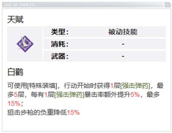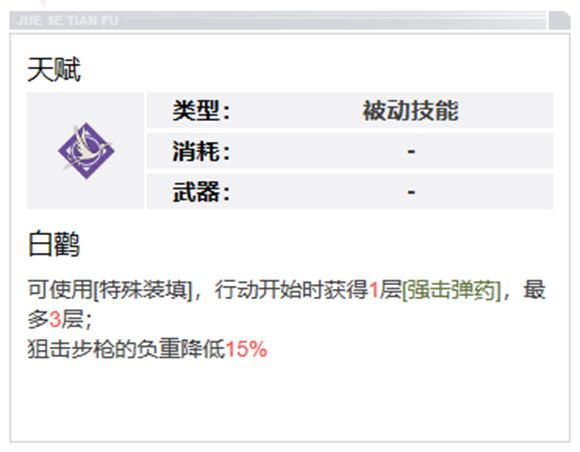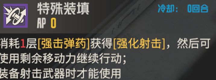 第一部分 “可使用[特殊装填],行动开始时获得1层[强击弹药],最多3层”为说明书式描述,其中强击弹药为一种特殊状态,能够提高技能倍率和强化技能效果,特殊装填为0ap0冷却的强化技能,能够通过消耗1层强击弹药来强化攻击,需要装备射击武器才能生效。