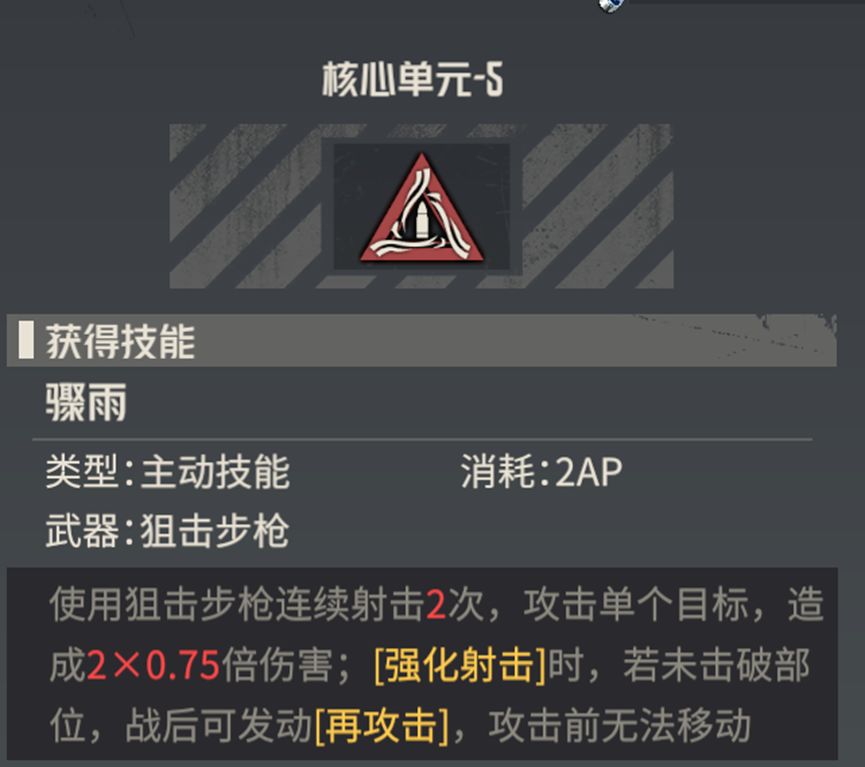 追歼射击:初始技能,闪避克星,此技能必定命中敌人,无视敌人闪避,消耗强击弹药时,还会额外施加闪避失效过,面对高闪避敌人时,对策效果显著。