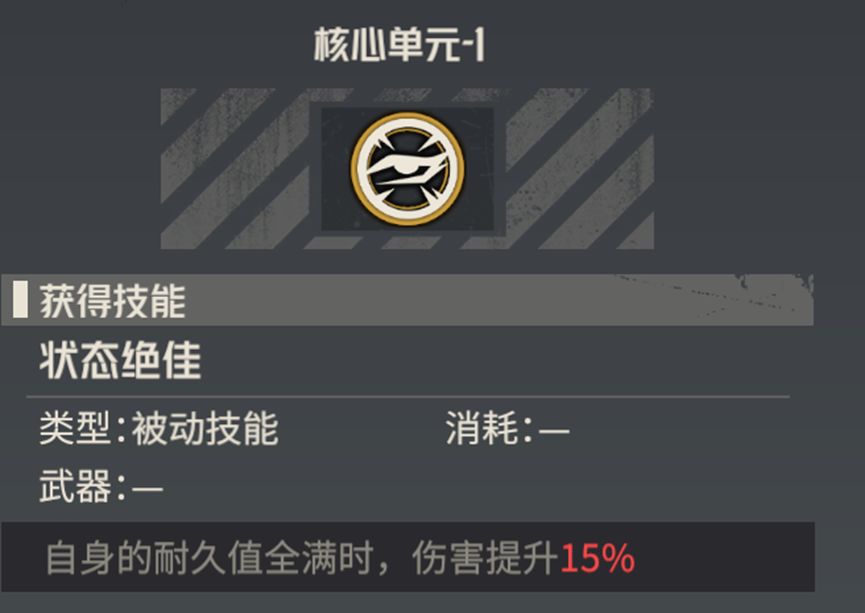 状态绝佳:一个简单的增伤技能,触发条件为自身耐久全满,对于远程输出的凯莉的说,满足此条件不算困难