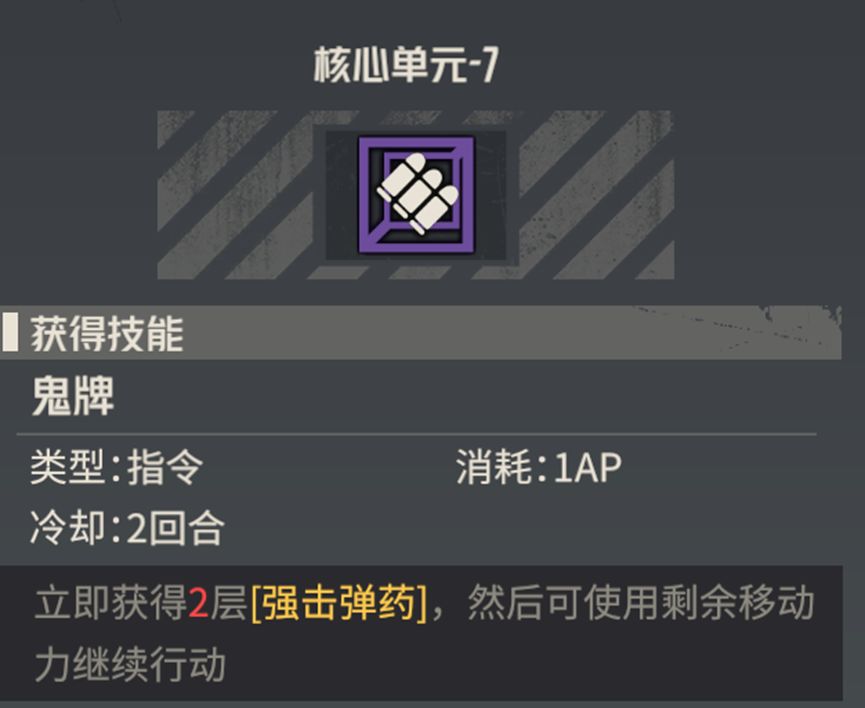 鬼牌:辅助性技能,补充强击弹药,凯莉的技能基本都需要强击弹药才能发挥完整威力,所以确保弹药充足非常重要