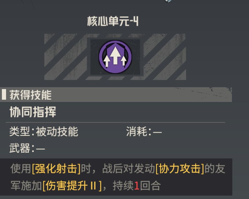 协同指挥:辅助性技能,战斗对参与协力攻击地友军施加伤害提升buff,需要使用强击弹药才能生效。配合应元件-号令会有不错表现。