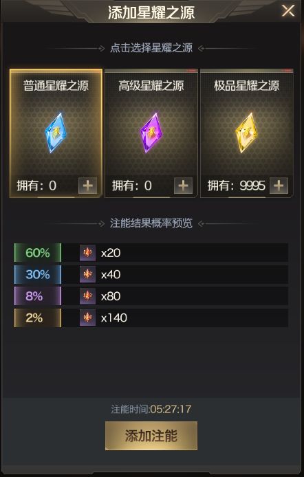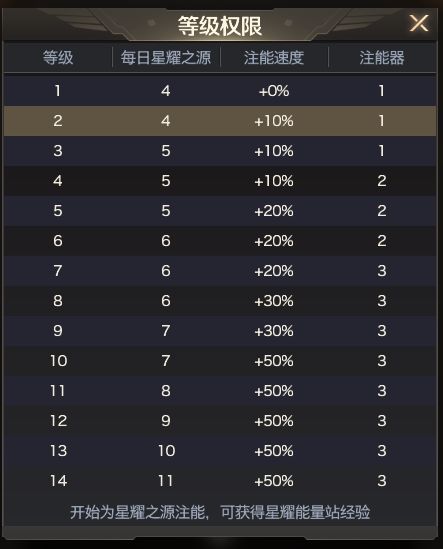 每次开始为星耀之源注能,可获得星耀能量站经验,进而提升星耀能量站等级,星耀能量站等级越高,可解锁更多的注能器、提升注能速度、提升每日免费获得的星耀之源数量。