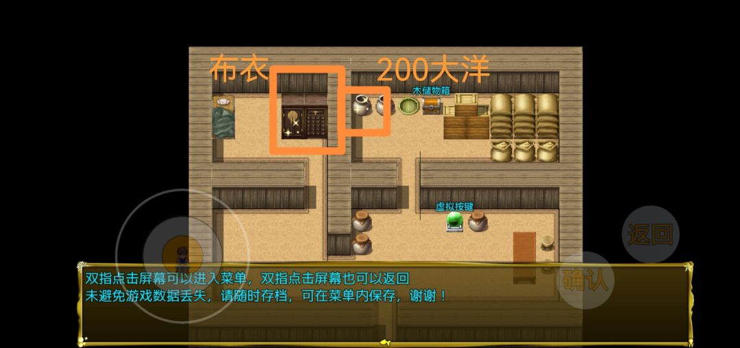 开局选项全部设定完之后进入游戏画面,在主角家的衣柜里获取一件『布衣』,罐子里获取『200大洋』。
