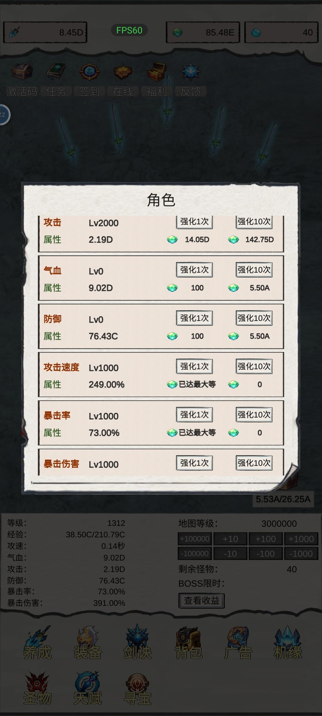 养成那个,攻击,生命,防御是不是没上线?暴击跟暴击率点到1000就满了,生命跟防御从头到尾没点一下,根本看不到怪。。。签到两次,一共玩的时间不超3小时,装备买的三件套只剩下最后那六个了。个人感觉天赋无脑点灵石就好了,毕竟有钱买装就能秒高级怪