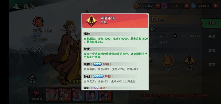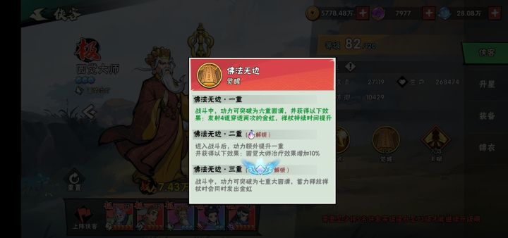 打法就是开局圆觉队长,卡蓄力时间打出可以无限穿透的禅杖,不会卡时间的就等第一个禅杖飞回左边再点屏幕发招就行。局内升级顺序优先圆觉招式满级,功法按照推荐顺序即可。