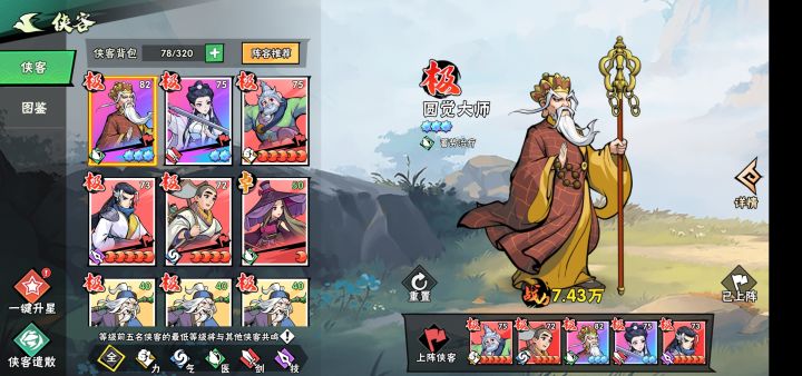 打法就是开局圆觉队长,卡蓄力时间打出可以无限穿透的禅杖,不会卡时间的就等第一个禅杖飞回左边再点屏幕发招就行。局内升级顺序优先圆觉招式满级,功法按照推荐顺序即可。
