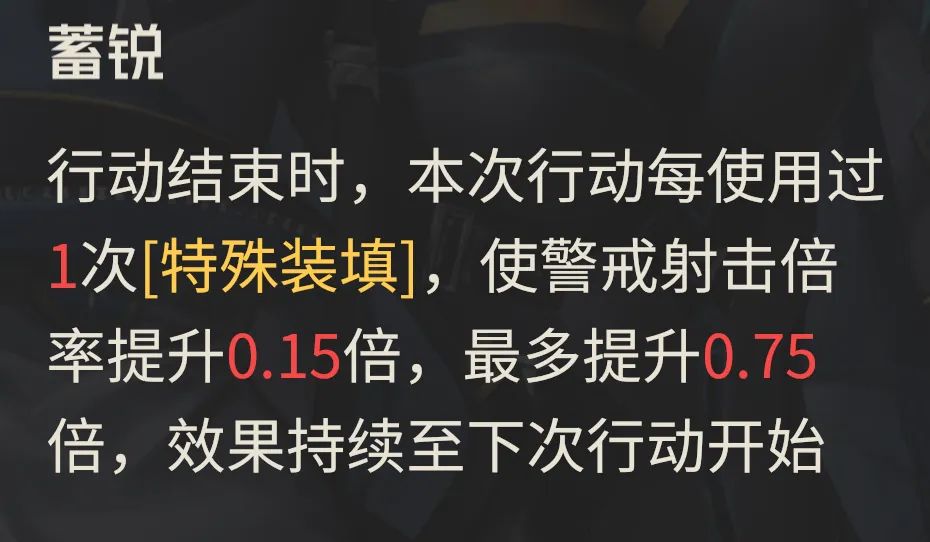 - 警戒射击:此次正式服对比过去的版本而言,狙击手职业的警戒射击倍率也统一提升到了基础0.5倍的伤害倍率,而凯莉由于有【蓄锐】技能的辅助,在这点上也是有一定特异化倾向的,未来部分能用的上警戒射击的关卡,大家可以优先关注下凯莉