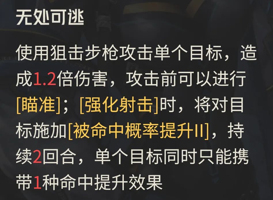 - 第5个增强点在于凯莉的辅助命中技能【无处可逃】包含的“被命中概率提升Ⅱ”debuff从测试服的1回合持续时间调整到了正式服的2回合持续时间,这点调整也基本上意味着之前我们所判定的论“辅助”,凯莉和艾莉森还有些五五开的味道这个结论就不存在了,目前在命中辅助这一点上凯莉基本上是完胜艾莉森了,而且有趣的是,由于中高练度下凯莉自身的输出也不错,所以【无处可逃】这个技能的命中概率提升还能为凯莉自己下个回合的【骤雨】输出提供不小帮助......真是自给自足,丰衣足食了
