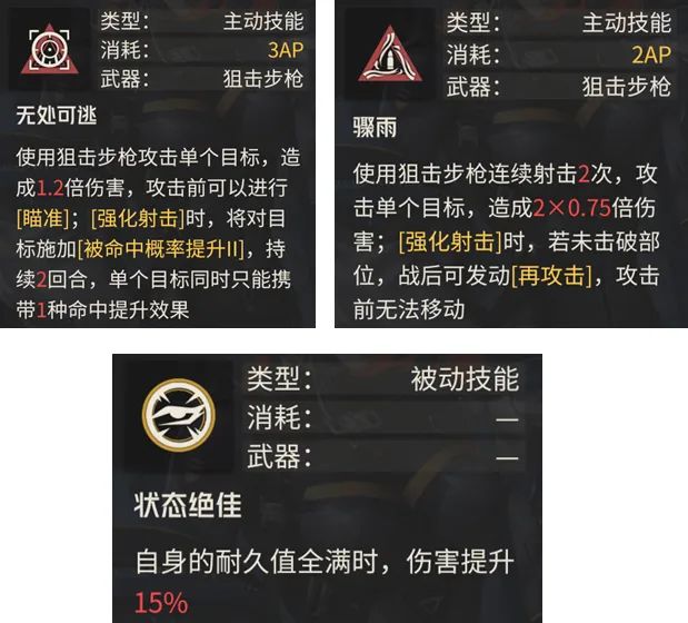 - 在打部分boss的过程中,如果boss的躯干没有特殊保护机制的话,可先用【无处可逃】给boss的躯干施加命中概率提升debuff,接着下回合开始便可用【强化射击】后的【骤雨】来输出了,此时命中躯干的概率有不小提升,且外加【状态绝佳】被动和雷克斯专属模组的增伤buff(【骤雨】的再攻击也能触发这个buff)就能打出不俗的伤害