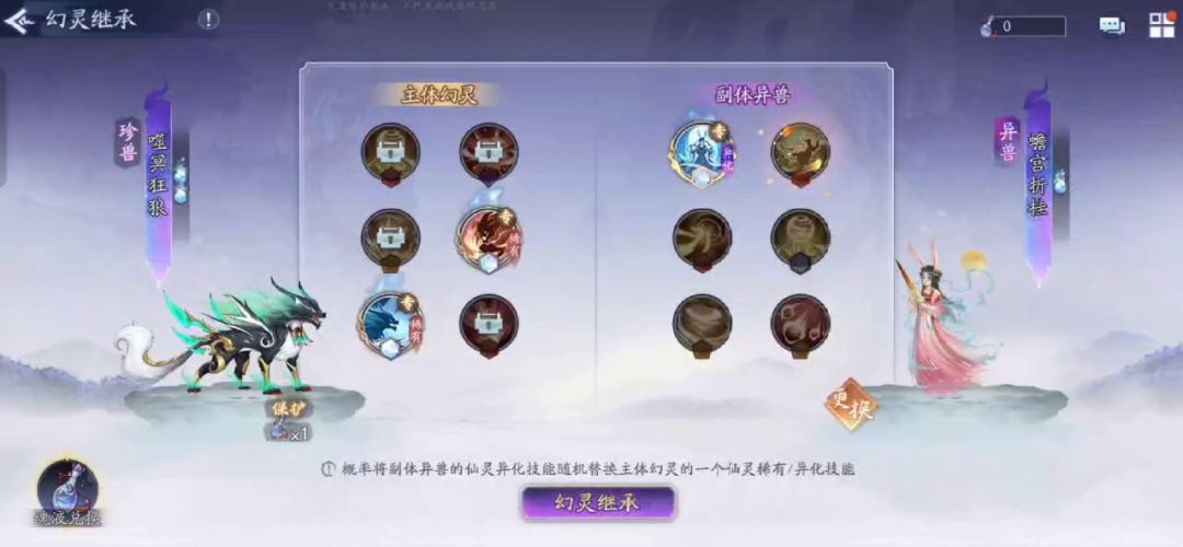 切记,只有俩火以上的幻灵才有资格开启继承,同时只有仙灵品质的异化技能的一火幻灵才可以被选择为副体。