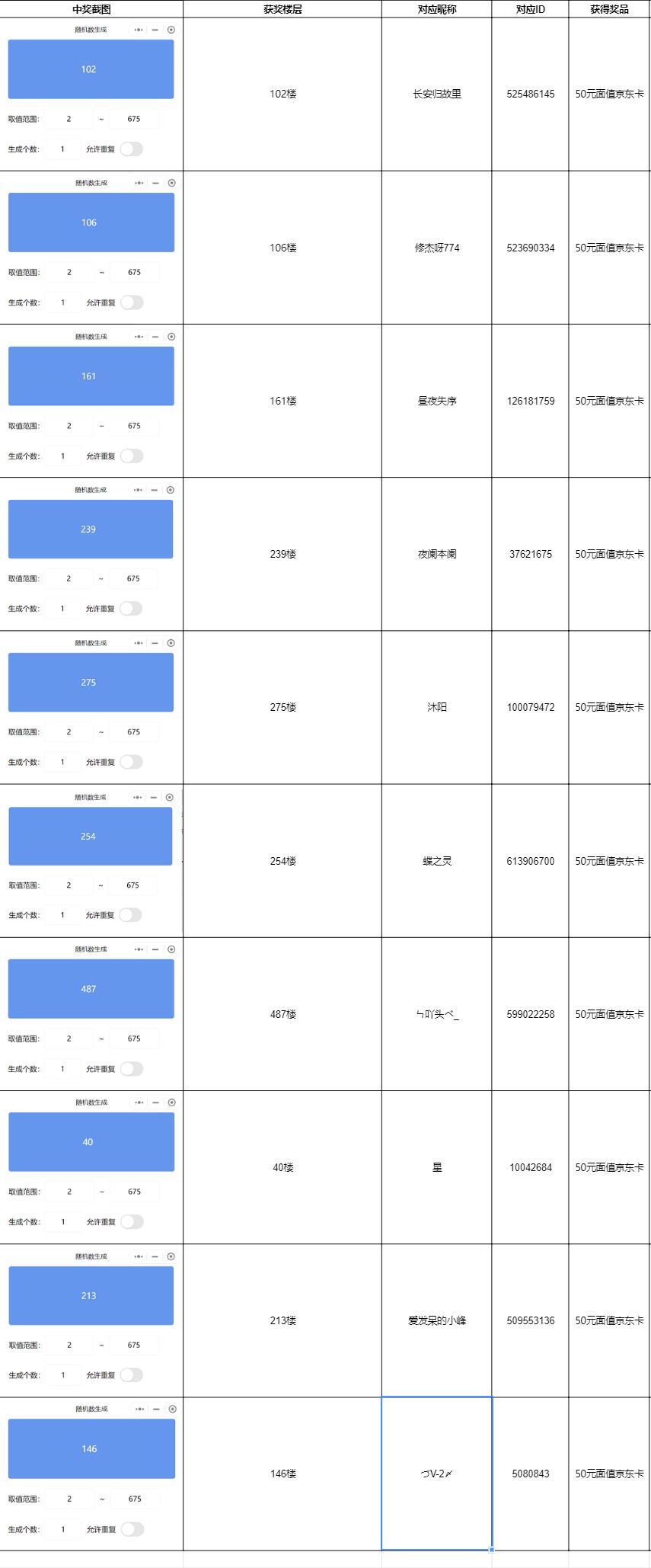 活动截至时有效楼层为675楼,经随机数抽取获取获奖楼层和名单如下: