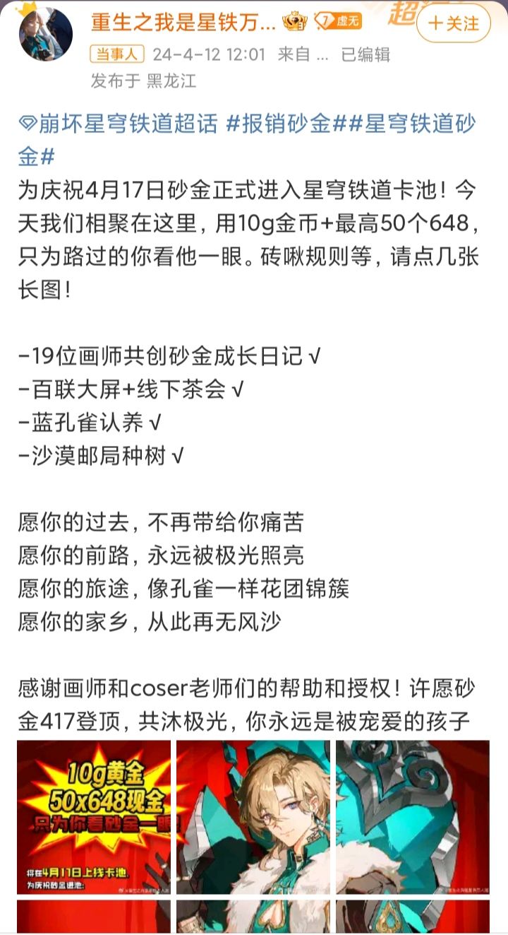 12号,星铁某粉丝,为庆祝4月17日砂金正式进入星穹铁道卡池!