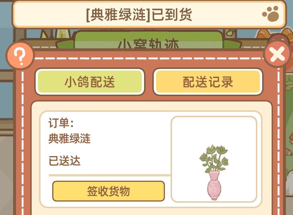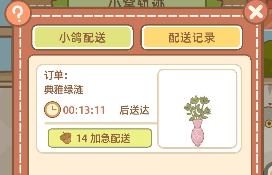 A:在购买物品后,点击界面下方左数第一个按钮,在“快递小鸽面板”可以进行签收操作。不同商品的配送时间不同,“加急配送”的功能为付一定数量的橡子该商品立即到达。花费橡子数量=等待时长分钟数,未为整时+1。时间走完后点击即可签收。