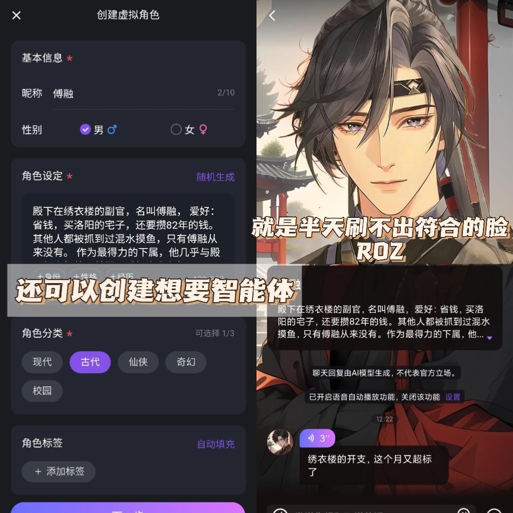 填写人物设定、背景、角色标签,调试声线,生成头像(真的不能自定义头像吗)……
