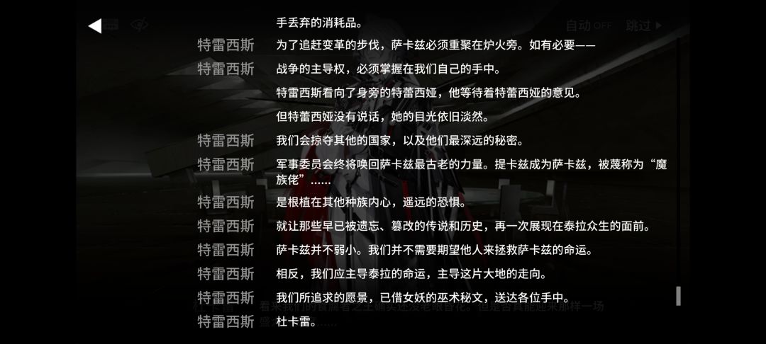 ①为了应对更强大的敌人和长久以来埋藏在萨卡兹民众心中的仇恨,特雷西斯认为萨卡兹需要一个强权政府,更高效地集中武力,去选择复仇抑或是防御。