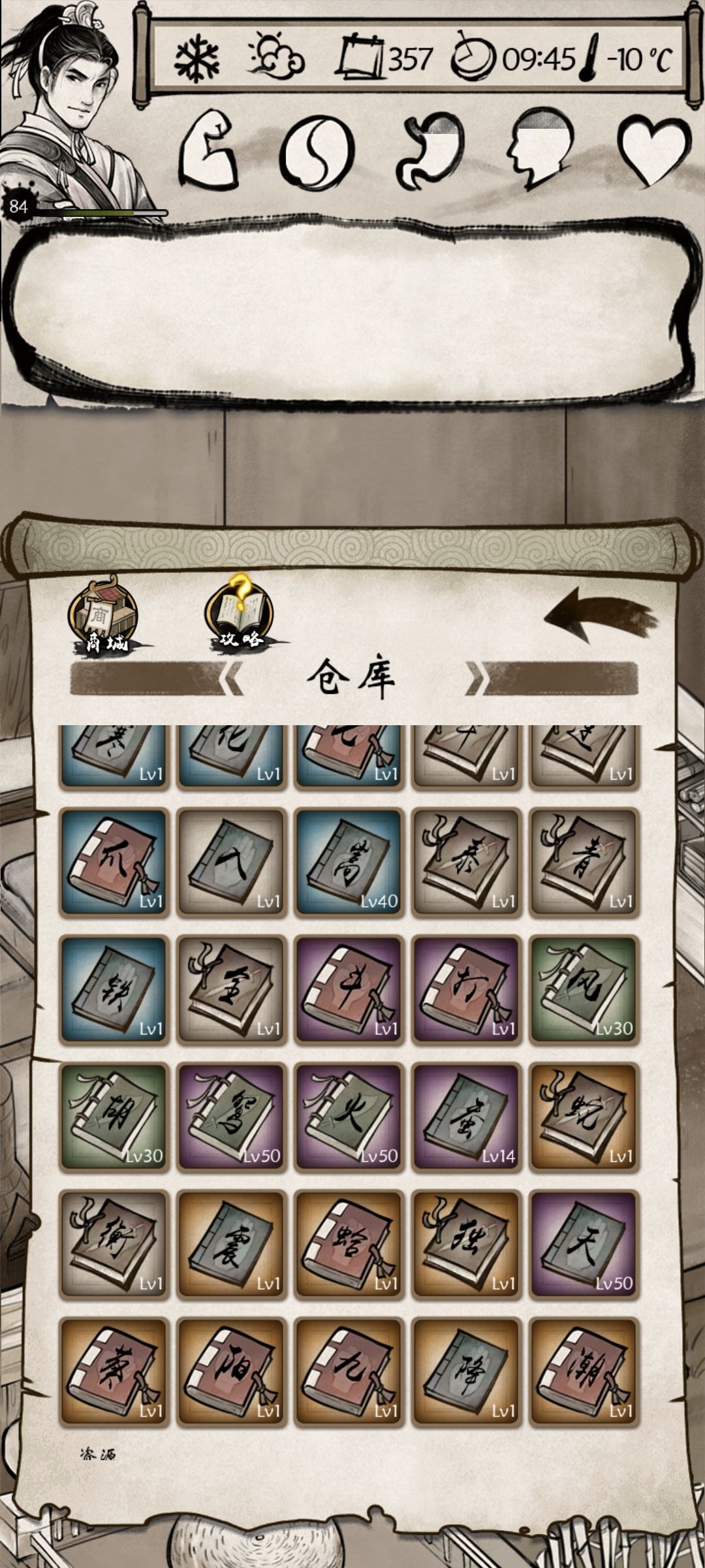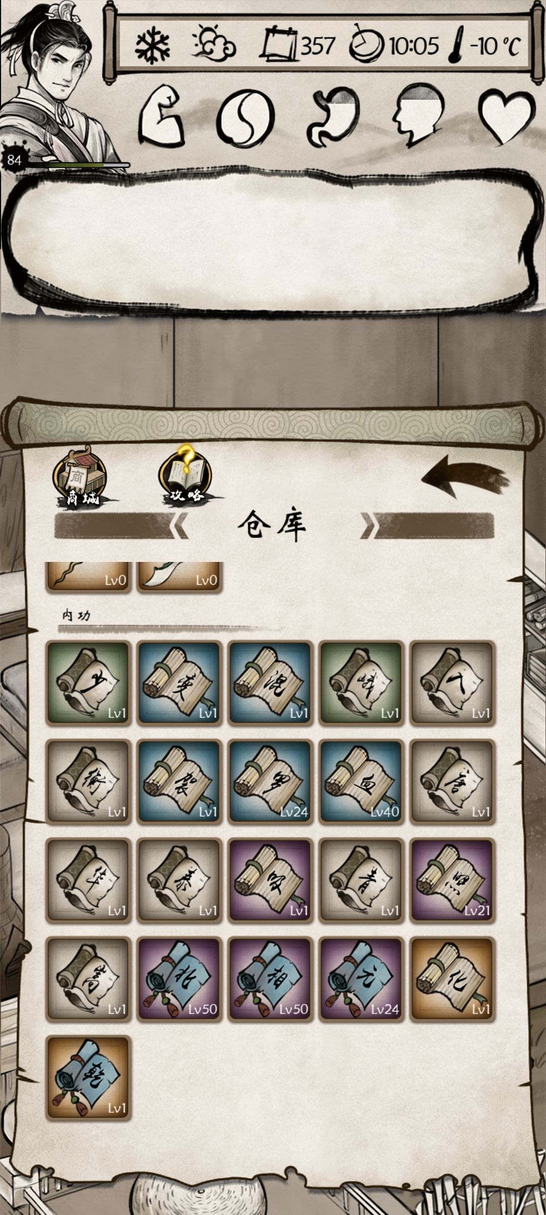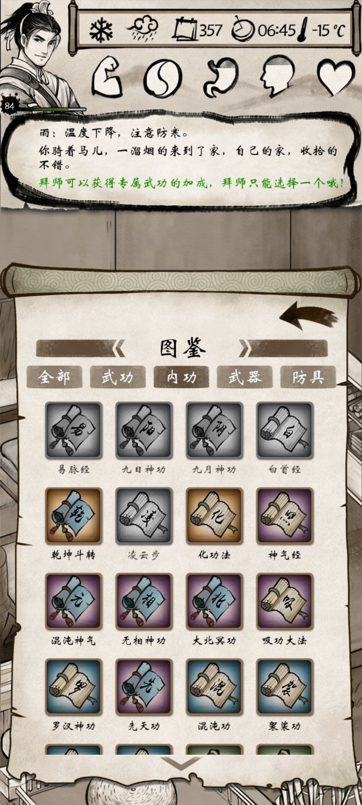 然后继续翻攻略,因为没有金色武功,很少有组合不要金色,最后没办法,只能试试先天+全真+武当。好在+攻击,不减血量,到了80级总算打过去了。