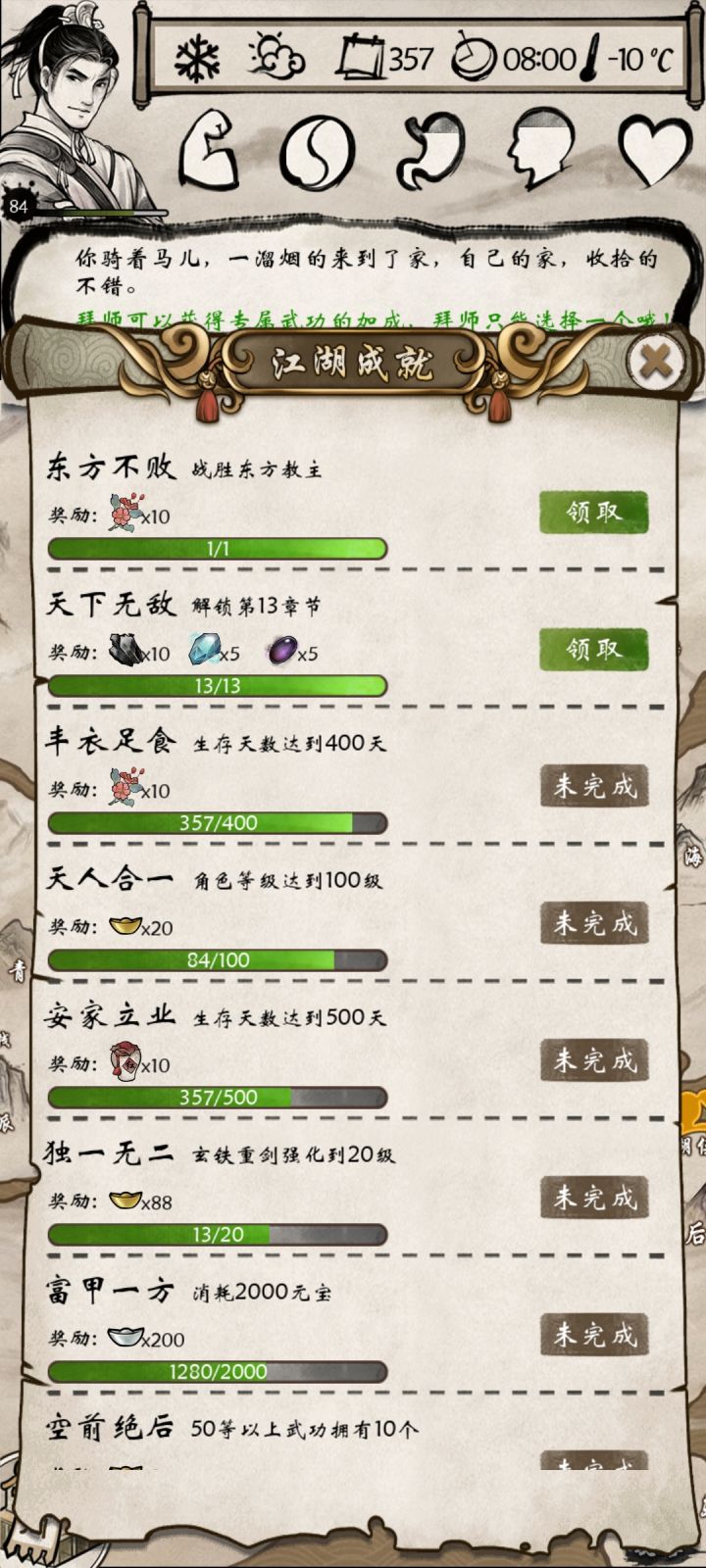 总结:不买新手礼包前期是真的难,卡点也不一样。但是相反的,前期难导致确实基础打的很扎实,打过欧阳德,有了金武功以后就很容易了。甚至第一次93级才打完东方不败,这一次84级就打完了。还是不错吧只能说,有探索的热情就好