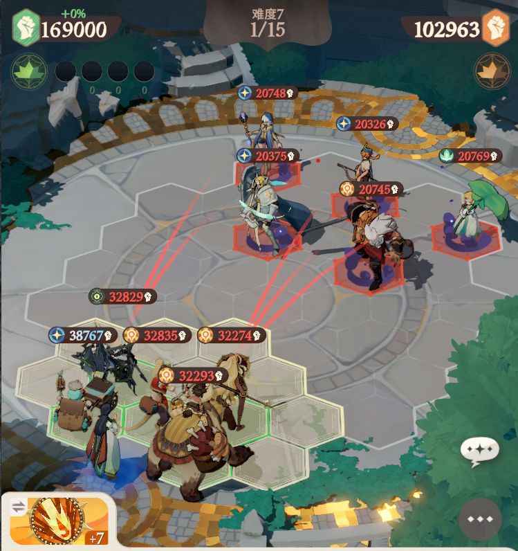 3、商人开大,为全部单位回能。豹女开大减伤,保证自己在敌方前排的围攻下存活。荆棘开大,根据战场情况解决敌方高威胁单位(可能需要手动释放)。