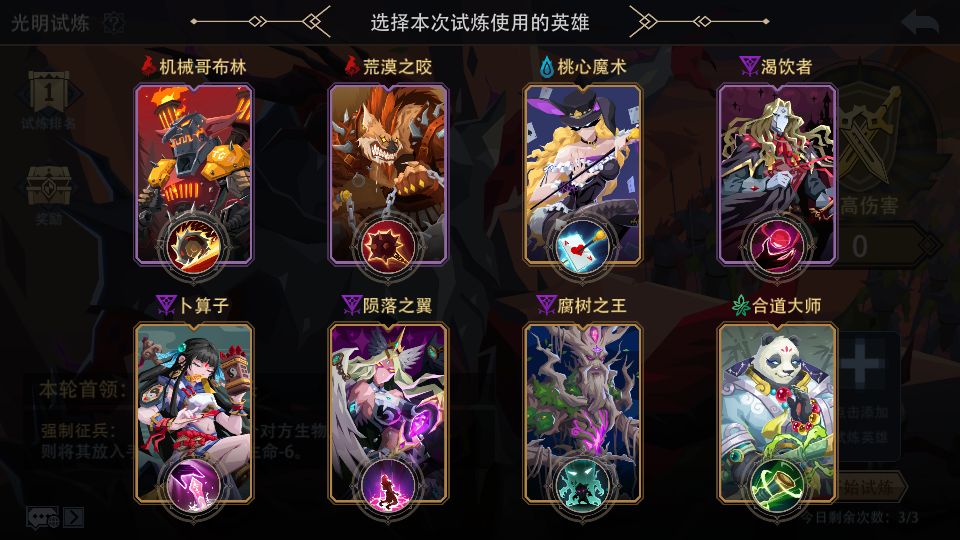 蘑菇补血流:(孢子+树妖+低语者+生命古树+治愈之风等)该常规打法一般可以拿满魔晶奖励,2000分伤害打满需要的条件较高。