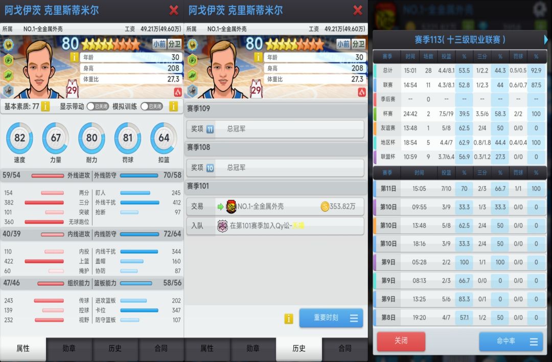 经理:他可以从一号位防到五号位,是名副其实的防守大师,在青训队我就发现他的天赋了,一开始他有着不错的身高和不输内线球员的力量,我只让他防守内线球员,他做的非常好,后来他为了防守小个子球员,开始训练自己的脚步,现在你也看到了,他是我们球队防守中最坚实的屏障。