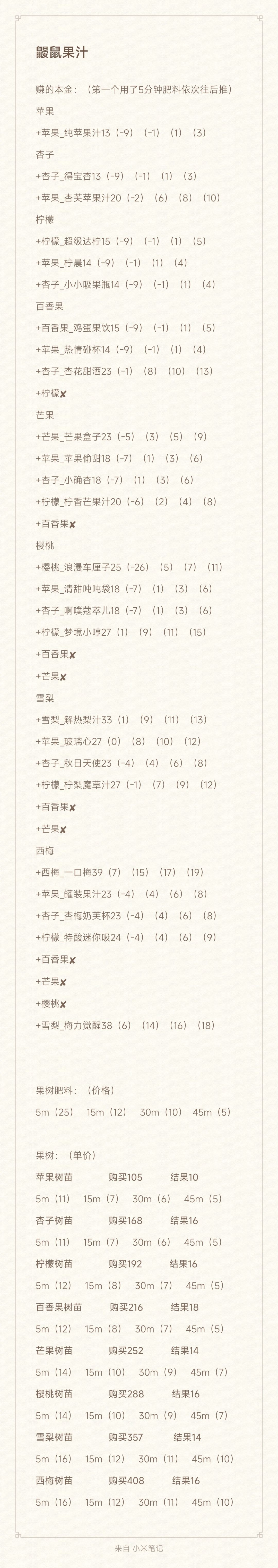 对了我打工鼠推荐果树都种西梅!那个大概西梅➕西梅45分钟果汁_“一口梅”赚19个松果!这是≈赚的本金!你2级调果汁就种樱桃➕柠檬5分钟果汁_“梦境小哼”赚≈1松果!反正没亏钱!把等级刷上去。后面三万三松果价格的水吧是3水果合成了!(记得把食物篮100空间买了)