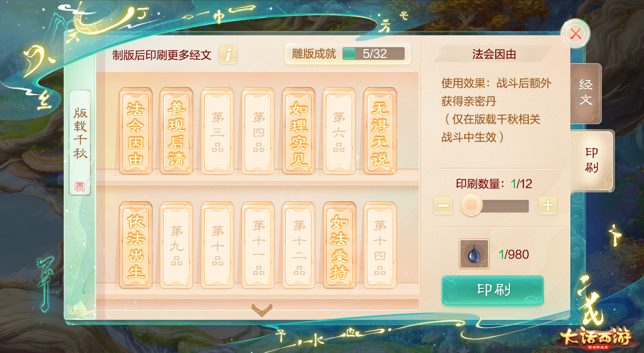 通过【雕版传播】收集的墨点,可以用于【上墨制版】。玩家可以通过拼字或者九宫格翻牌为经文上墨,成功拼出四字经文即可制版印刷。印刷好的经文可以使用,会影响下一场战斗的奖励(仅在版载千秋相关战斗中有效)。