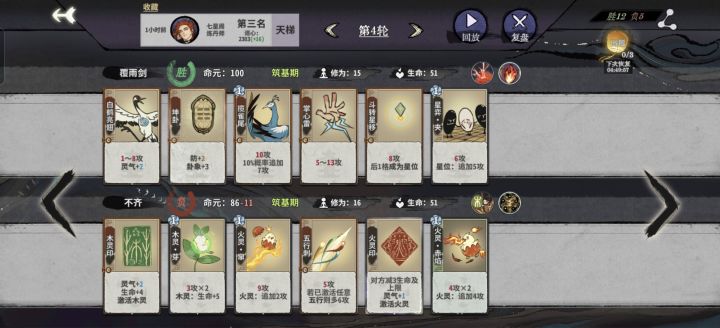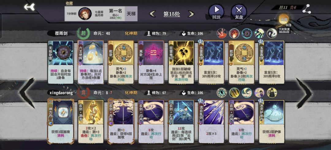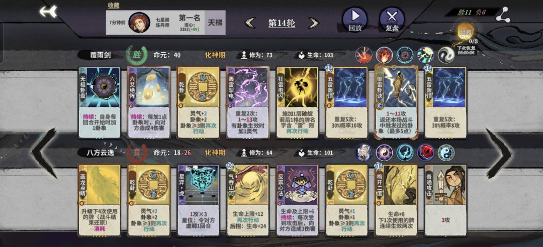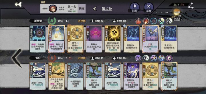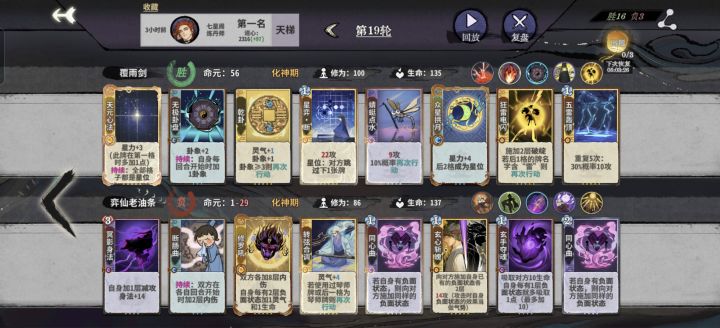 元婴:仙命优先拿牌,其次斩道,其次修为,先天卦。血多就拿易数化劫。牌不好7轮上本,牌好8轮上本,D空找六爻轰雷,看对手有没有多段和狂剑有就留虎,找御雷蜻蜓。