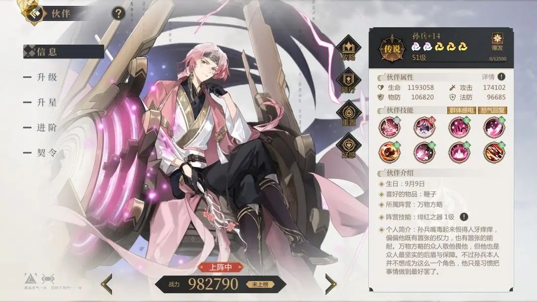 十二律:群攻减攻,概率控制,高星额外附带减益效果,且开局 100 怒,攻 击减益目标可回怒,搭配朱珠、孙兵三人组无限大(对面不减员情况)