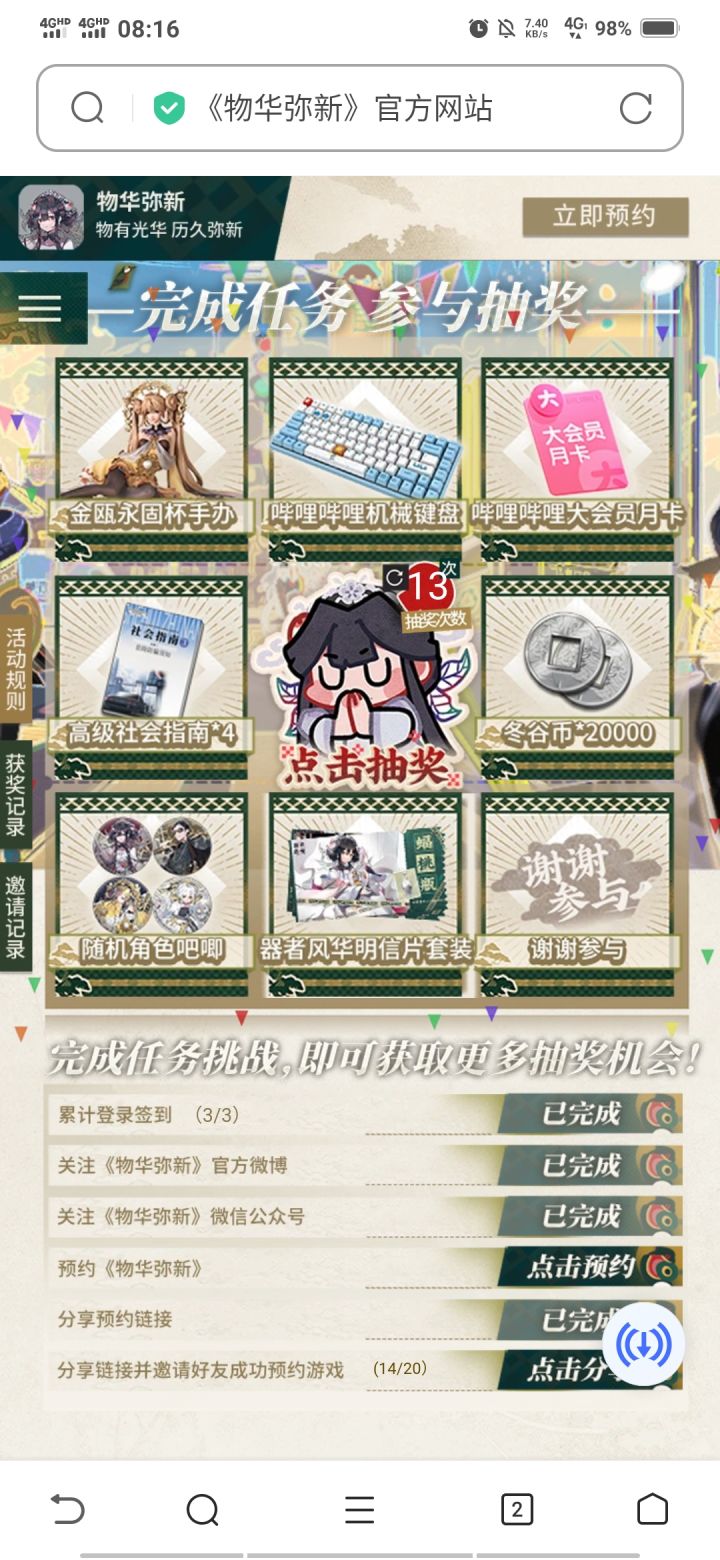 3,官方网站预约活动抽奖!通过官方网站进入,预约游戏领取大量奖励,并且还有抽奖活动,可以活动游戏内养成资源!还有实物奖励!