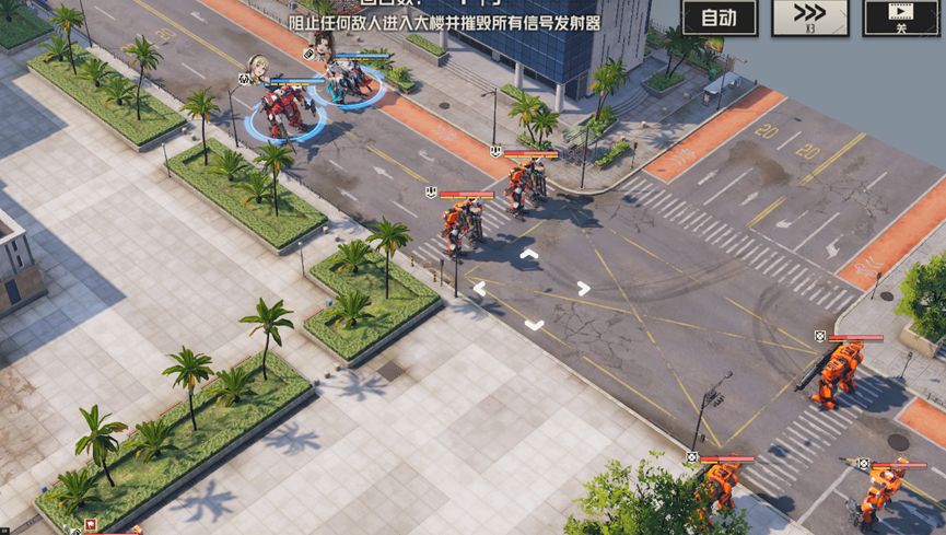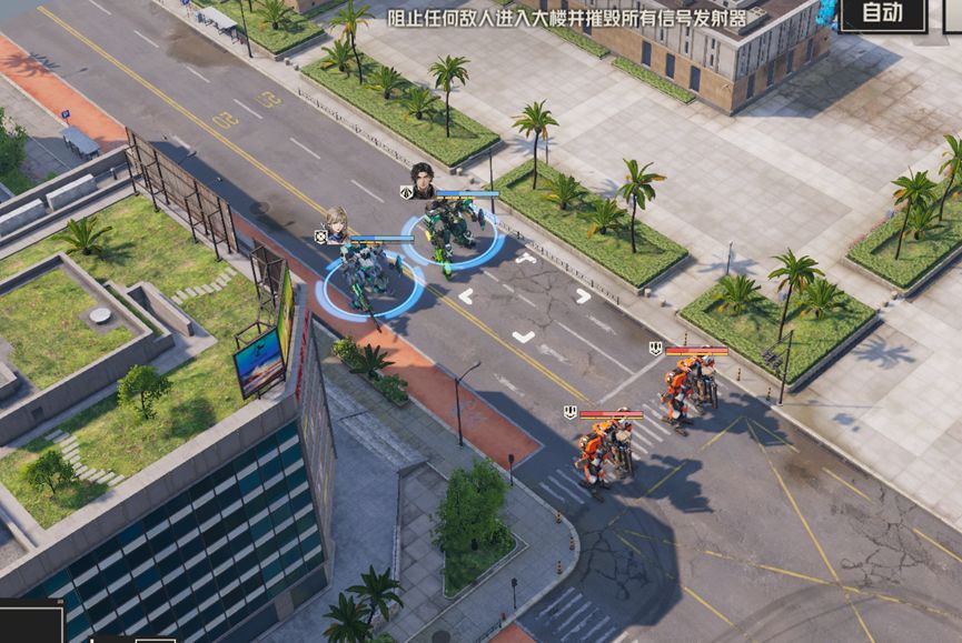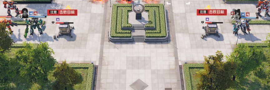 本关任务是破坏两个信号塔,除此之外,还要注意不要让敌人进入大楼,并且本关我们不需要消灭全部敌人,总体上以破坏信号塔为主。本关机师被分为三路,实际上对于我们来说是比较有利的,左右两路可以让高机动性机师突破,破坏信号塔,而中间只要做好防守就行。